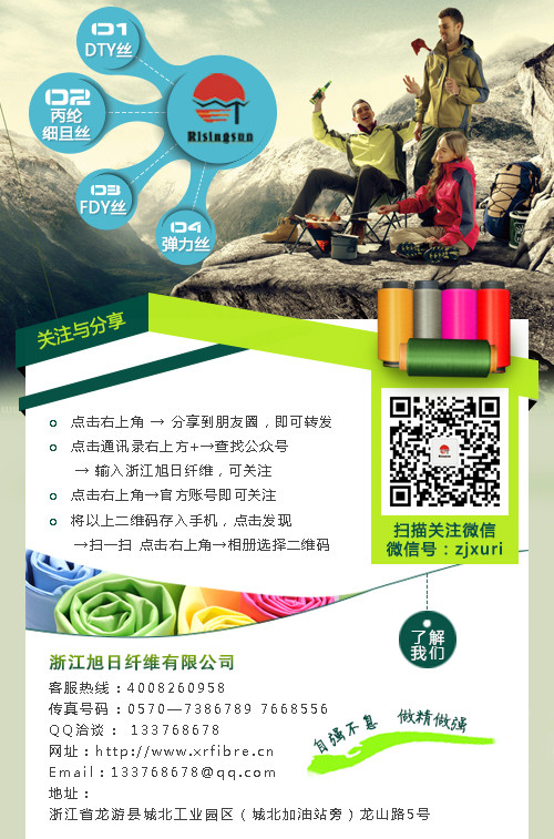 浙江旭日纖維有限公司專業(yè)生產(chǎn)丙綸細(xì)旦絲、丙綸彈力絲、丙綸超細(xì)旦絲等產(chǎn)品,了解產(chǎn)品詳情,掃描圖片二維碼哦!